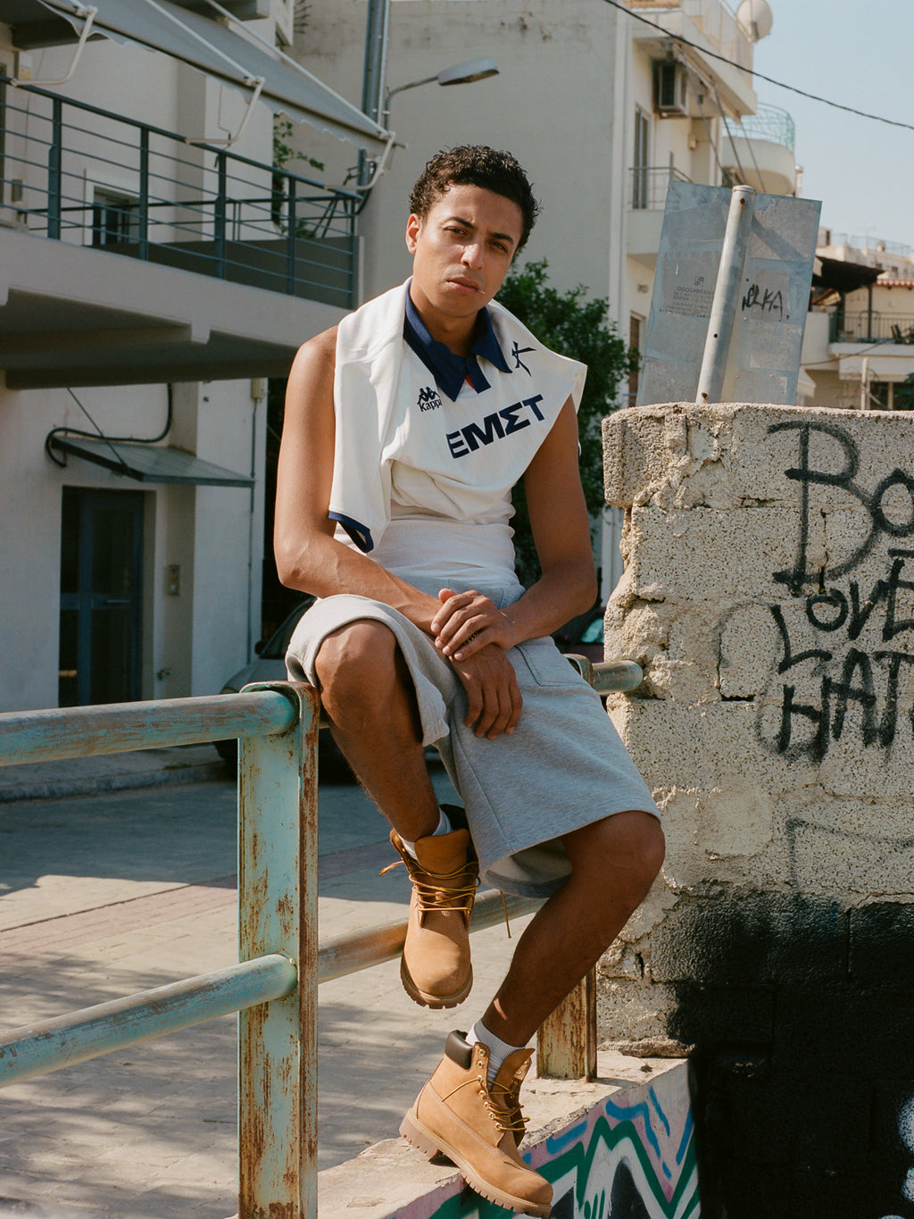 In the early years upon the club’s founding in 1966, Kallithea played in white shirts with navy shorts, prompting fans to give them the nickname "England.” Playing off that history, this season's away shirt is an England-inspired look, in a clean white with subtle debossed lines through the body, accented with flock graphics and a soft, slightly oversized collar. On the chest, the shirt features the ΕΜΣΤ wordmark of the National Museum of Contemporary Art Athens, now in the second year of a first-of-its-kind partnership between the two institutions.
